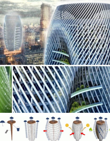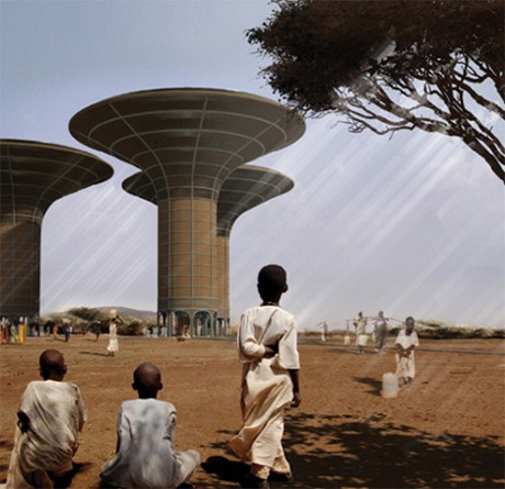 蘇丹摩天水塔 在面積廣闊的蘇丹沙漠,淡水成為最寶貴的資源之一,獲取淡水的難度超乎人們想象。有意思的是,沙漠地下深處也隱藏著世界上最大的地下湖,如果能夠有效加以利用,當地居民的生活便會發生翻天覆地的變化。波蘭建筑事務所H3AR提出了一種解決之道,即建造外形好似當地猴面包樹的水塔群并利用地下泵抽水。水塔內建有一個水處理廠、一所醫院、一所學校以及一個食物儲藏中心。6.集雨摩天樓