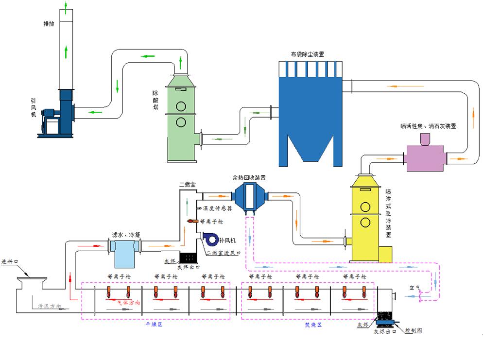 等離子火炬污泥焚燒裝置由等離子火炬、等離子火炬電源、進出料裝置、隧道窯(由多個窯爐單元組合而成)、攪拌輸送、尾氣處理系統組合而成。(如圖所示)
