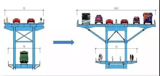 大修后,松浦大橋?qū)⑴f貌換新顏,上層拓寬成雙向6車道,橋面寬24.5米,不再承擔(dān)鐵路交通運營的下層,也將作為慢行交通過江專用通道。