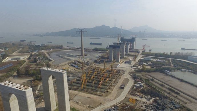 五峰山長(zhǎng)江特大橋位于泰州長(zhǎng)江大橋和潤(rùn)揚(yáng)長(zhǎng)江大橋之間,其北岸位于鎮(zhèn)江市丹徒區(qū)高橋鎮(zhèn),南岸位于鎮(zhèn)江新區(qū)五峰山腳下,是連鎮(zhèn)鐵路和京滬高速公路南延的關(guān)鍵控制性工程。大橋全長(zhǎng)6409米,其中主跨為1092米,采用單跨懸吊鋼桁梁懸索結(jié)構(gòu),上層為8車道高速公路,設(shè)計(jì)速度每小時(shí)100公里;下層為4線高速鐵路,設(shè)計(jì)速度每小時(shí)250公里。