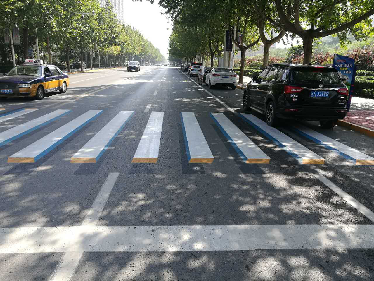 3D斑馬線屬于三維新型減速標志,遠看就像一排條狀小礅,不論是白天還是夜間,均有明顯凸起感,從而提醒司機過斑馬線時減速慢行。現場可以看到,不僅機動車駕駛人接收到強烈的禮讓“警示”信號,就連行人也被這一炫酷的立體斑馬線吸引。