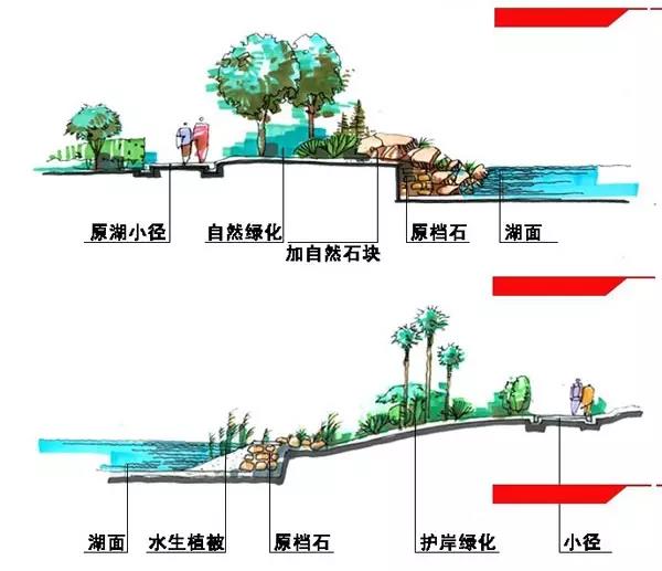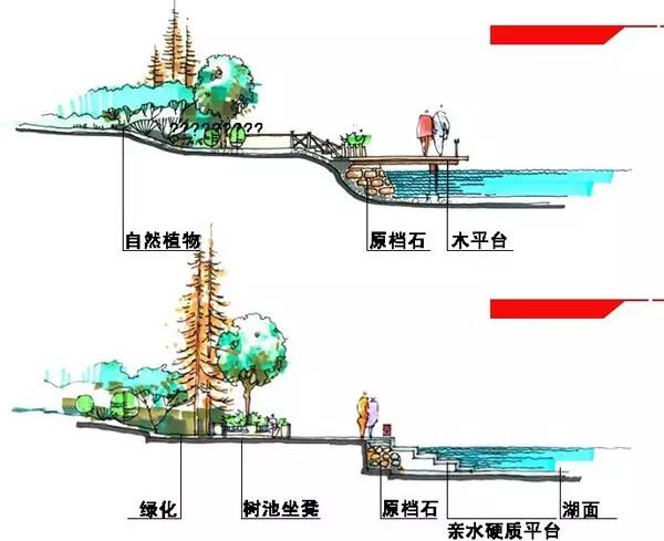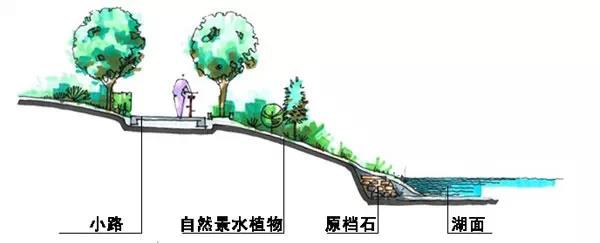 駁岸的植物配置很重要,既能使岸上的景色和水融為一體,又對水面空間的景觀起著主導的作用。駁岸一般分為土岸,石岸,混凝土岸等等,自然的或規則的。