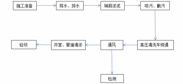 使用泥漿泵將檢查井內(nèi)污水排出至井底淤泥。將需要疏通的管線進(jìn)行分段,分段的辦法。根據(jù)管徑與長度分配,相同管徑兩檢查井之間為一段。