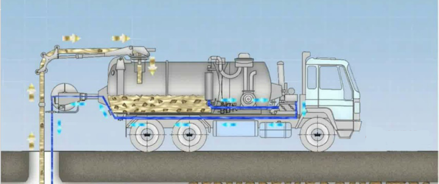 高壓水車把分段的兩檢查井向井室內(nèi)灌水,使用疏通器攪拌檢查井和污水管道內(nèi)的污泥,使淤泥稀釋;人工要配合機械不斷地攪動淤泥直至淤泥稀釋到水中。