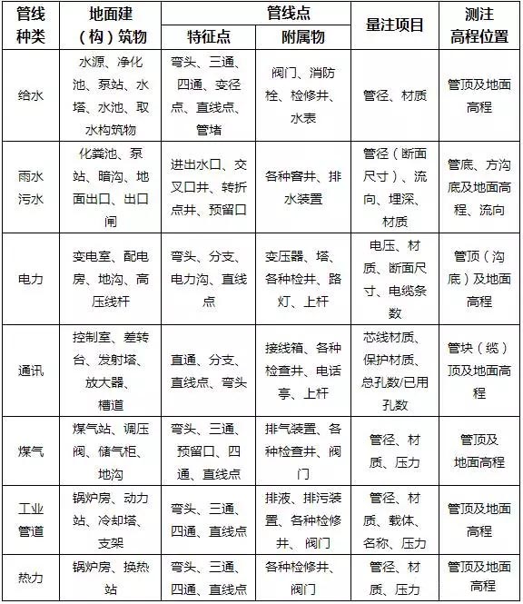 明顯管線點和新建管線點應按下表所示內容查明管線上的建(構)筑物和管線點。