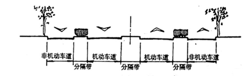 以三條分隔帶使對向車流分行、機動車與非機動車車種分流的橫斷面形式。