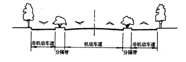 適用于機動車交通量大、車速要求高、非機動車多且道路路幅較寬的大型場地交通干道,如居住區主要道路等。