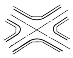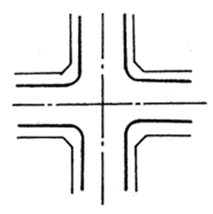 兩條道路垂直或近似垂直相交;其形式簡單,交通組織方便,街角建筑易于處理,適用范圍廣,是最基本的交叉口形式。
