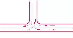 主要公路與次要公路的T形交叉,當轉彎交通量較大而會導致直行車輛的過分減速時,應采用加寬式T形交叉左轉彎交通量較大者,可采用該型式。