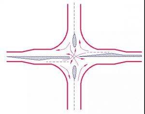 采用環形交叉(俗稱轉盤),使進入交叉口后的車輛按逆時針方向環繞中心島作單向行駛至駛出口,均以同一方向循序前進,消滅交叉口的沖突點。
