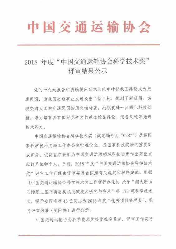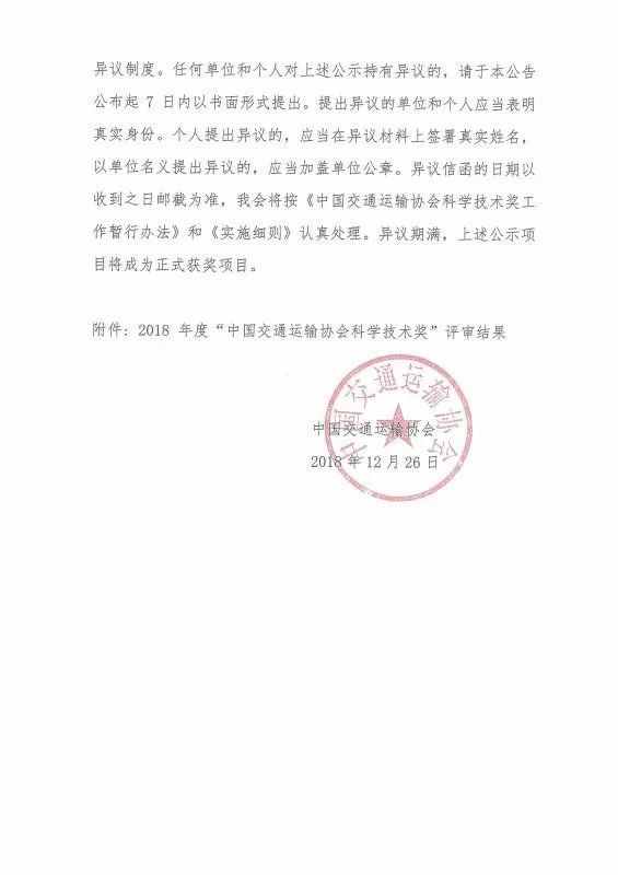 2018年度“中國交通運輸協會科學技術獎”評審結果公示