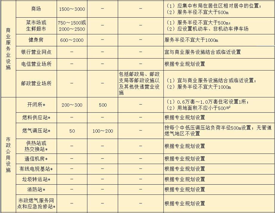 注:1 加*的配套設(shè)施,其建筑面積與用地面積規(guī)模應(yīng)滿足國(guó)家相關(guān)規(guī)劃和建設(shè)標(biāo)準(zhǔn)的有關(guān)規(guī)定;
