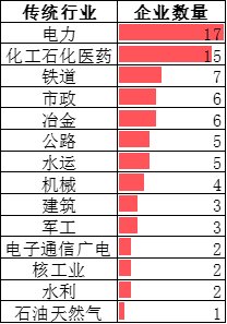 共涉及 14 個細分行業(yè):電力、電子通信廣電、公路、核工業(yè)、化工石化醫(yī)藥、機械、建筑、軍工、石油天然氣、市政、水利、水運、鐵道、冶金。其中,電力行業(yè)企業(yè)最多,有 17 家;其次為石油化工醫(yī)藥行業(yè),有 15 家企業(yè),鐵道行業(yè)居第三,有 7 家企業(yè)。