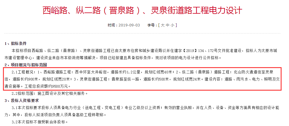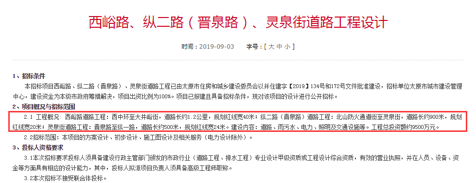 太原市住房和城鄉建設局對《西峪路、縱二路(晉泉路)、靈泉街道路工程設計》、《西峪路、縱二路(晉泉路)、靈泉街道路工程電力設計》和《西峪路、縱二路(晉泉路)、靈泉街道路工程勘察》的招標文件予以批準建設,此番三條道路工程設計、電力設計、勘察招標齊出臺,標志著我市又將新增三條道路,力促片區發展。