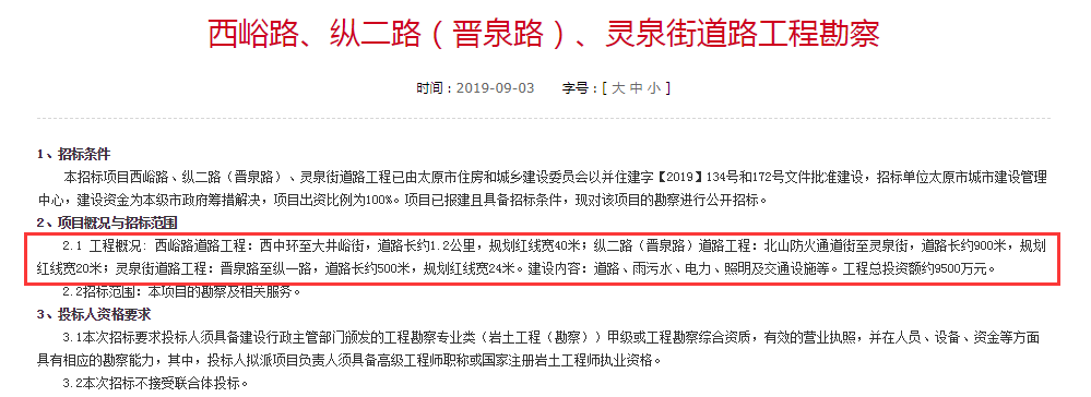 工程概況:西峪路道路工程:西中環至大井峪街,道路長約1.2公里,規劃紅線寬40米;縱二路(晉泉路)道路工程:北山防火通道街至靈泉街,道路長約900米,規劃紅線寬20米;靈泉街道路工程:晉泉路至縱一路,道路長約500米,規劃紅線寬24米。建設內容:道路、雨污水、電力、照明及交通設施等。工程總投資額約9500萬元。