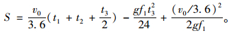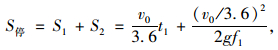 式中,v0為汽車運行速度;f1為縱向摩阻系數,依車速及路面狀況而定;g為重力加速度(9.8 m/s2);t1為駕駛者反應時間,取2.5 s(判斷時間1.5 s,運行時間1.0 s)。