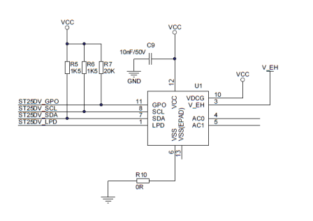 射頻閱讀器和識別器的核心在于RFID芯片。通常RFID芯片供電電壓1.8V-5.5V,帶有4K、16K或64K的E2PROM,通過片內串行總線I2C或者射頻進行數據傳輸。圖2為RFID芯片ST25的識別器電路原理圖。射頻識別芯片通過SCL和SDA和主控制器芯片完成通訊??刂破髟俸蜕衔粰C完成信息交換傳輸。