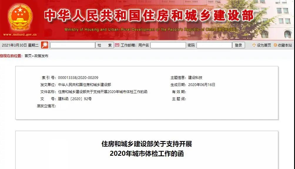 據了解,2018 年,住房和城鄉建設部開展城市體檢工作。2019 年,選擇 11 個城市開展體檢試點。2020 年,住房和城鄉建設部發文《關于支持開展2020年城市體檢工作的函》中選擇 36 個樣本城市全面推進城市體檢工作,全面查找城市發展和規劃管理中存在的短板問題,提出解決方案。