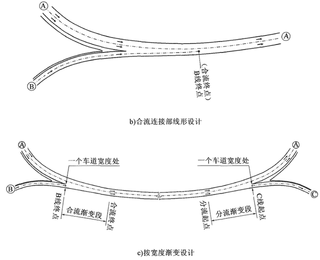 《細則》給出的分合流示意圖不夠全面。分合流連接部,建議依據車道個數適應交通量的情況,可采用插入式、漸變式和直接式、輔助式,或其組合。
