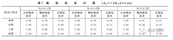 (2)單方向縱坡坡段的雨水口,增加其數量將提高雨水口正面攔截速度和側面截流效率,但對雨水口總截流效率提升作用有限,而我國標準圖集推薦泄水能力隨箅子數量增加而快速增加(見表7)。