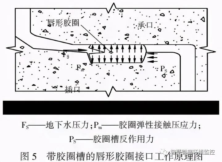 帶膠圈槽接口如圖5 所示。膠圈三相受擠,增加反力PS,加大了膠圈對工作面表面的擠壓接觸應(yīng)力,有利于提高接口的抗?jié)B能力。因此,在接口抗?jié)B要求嚴格的管道中建議采用帶膠圈槽接口。在中、大型地下綜合管廊工程中應(yīng)優(yōu)先選用帶膠圈槽楔形膠圈密封接口。
