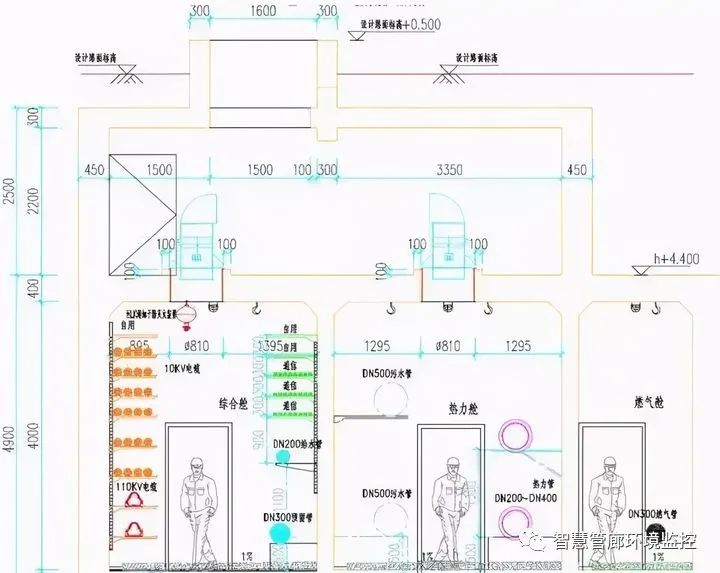 管廊的通風機房一般利用管廊上方的空間設(shè)置,同時考慮到相交管線的穿越,管廊頂部覆土深度一 般為2.5-3.0m。這樣的做法導致起點的雨污水支管標高與管廊就不能匹配。但是,管廊的覆土深度并不是只有2.5-3.0m,在特殊情況下,滿足抗浮 的 前提下,將管廊覆土減少至1.5m,此時,進排風井可采用外掛式,滿足通風需求,同時結(jié)合雨污水標高,甚至將起點雨污水管道納入綜合管廊。