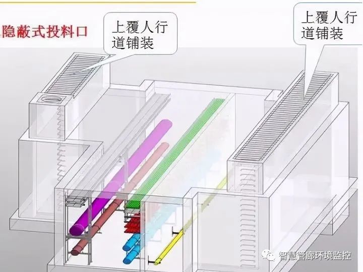 吊裝口是管線、電纜進入管廊的通道,分剛性管道吊裝口和纜線吊裝口,不能一概而論,大多采用地上式做法,如下圖所示。這種做法最大的弊端就是對景觀影響大。較好的做法是針對管線、電纜吊裝的特性分別設(shè)置吊裝口,且剛性管道隱蔽式吊裝口和地上式結(jié)合設(shè)置,一般一條線路上采用一個地上式,其余均為隱蔽式,這樣既 解決了管線安裝又最大限度降低環(huán)境影響。