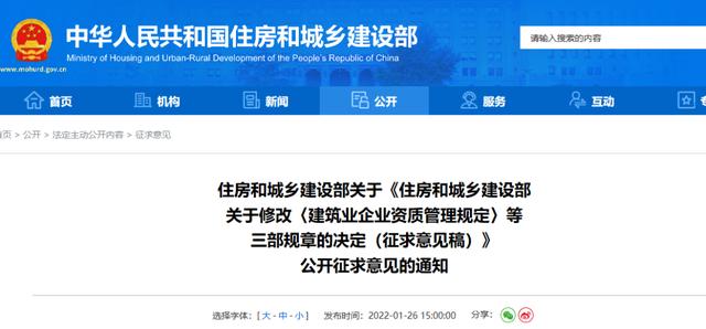 為落實建設工程企業資質管理制度改革要求,住房和城鄉建設部擬修改《建筑業企業資質管理規定》《工程監理企業資質管理規定》《建設工程勘察設計資質管理規定》,起草了《住房和城鄉建設部關于修改〈建筑業企業資質管理規定〉等三部規章的決定(征求意見稿)》,現向社會公開征求意見。公眾可通過以下途徑和方式提出反饋意見: