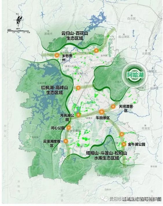 四片:紅楓湖-高峰山生態(tài)區(qū)域、云歸山-百花山生態(tài)區(qū)域、阿哈湖生態(tài)區(qū)域、塔帽山-斗篷山-松柏山水庫生態(tài)區(qū)域,強化區(qū)域生態(tài)保育功能,發(fā)揮區(qū)域生態(tài)基底作用。