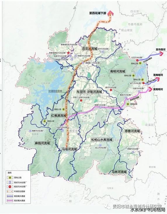 尾水收集:已建馬場至湖潮至南明河的貴安尾水通道,規(guī)劃沿紅楓湖、百花湖新建環(huán)湖綜合管廊,收集沿線朱家河、馬場、高峰、金華等10座污水處理廠尾水,排放至百花湖下游,減輕污水尾水對紅楓湖及百花湖的污染,排放標(biāo)準為準Ⅳ類水,計劃遠期建設(shè)完成。新增金竹環(huán)阿哈湖南部截污管廊、大凹尾水通道,尾水采取跨流域排放模式,分別排放至市西河及南明河,減輕污水尾水對阿哈湖的污染,排放標(biāo)準為準Ⅳ類水,計劃近期建設(shè)完成。