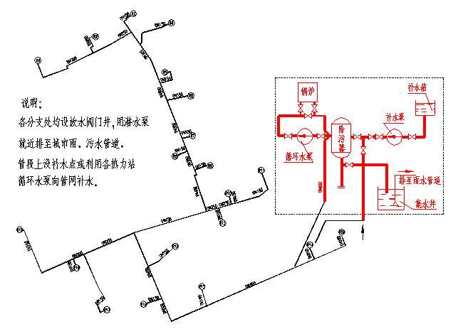 熱水網干線設分段閥門。輸送干線2~3km;輸配干線1~1.5km。