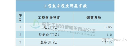 工程復(fù)雜程度調(diào)整系數(shù):0.8~1.2(工程復(fù)雜程度具體調(diào)整系數(shù)由工程咨詢機(jī)構(gòu)與委托單位根據(jù)各類(lèi)工程情況協(xié)商確定)。