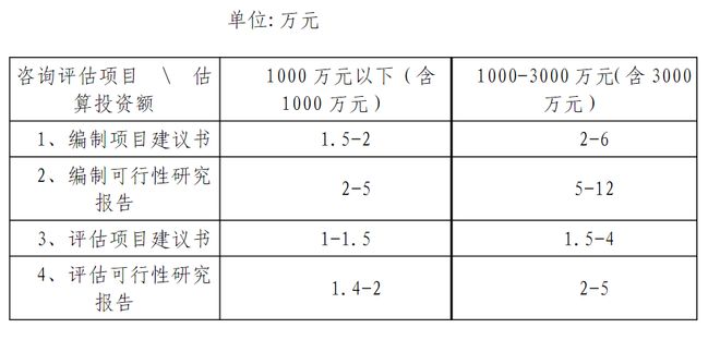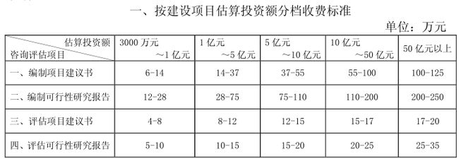 投資決策咨詢包括編制項目建議書、編制可行性研究報告、評估項目建議書、評估可行性研究報告等,取費可參考《國家計委關于印發建設項目前期工作咨詢收費暫行規定的通知》(計價格〔1999〕1283號),該文件提出了投資額在3000萬元以上的建設項目前期工作咨詢收費標準,而投資額3000萬元以下的建設項目由各省自行制定,如湖北省制定了相應的地方標準——《省物價局關于制定估算投資額3000萬元以下建設項目前期工作咨詢收費標準的通知》(鄂價房服〔2001〕107號),具體收費標準根據估算投資額在收費標準相對應的區間內用插入法計算。