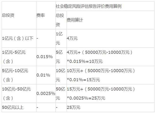 按照上述調整系數對建設項目社會穩定風險評估咨詢服務收費進行調整后,編制建設項目社會穩定風險評估報告的收費低于6萬元的,按6萬元計取,高于50萬元的按50萬元計取;評價建設項目社會穩定風險評估報告的收費低于4萬元的,按4萬元計取,高于25萬元的,按25萬元計取。