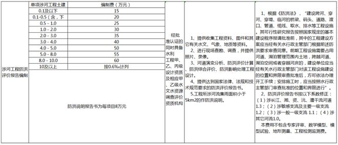 防洪評價咨詢取費可參考地方收費標準,如湖南省地方標準——《湖南省物價局、湖南省水利廳關于公布水利系統服務性收費項目和標準的通知》(湘價服〔2013〕134號),具體如下: