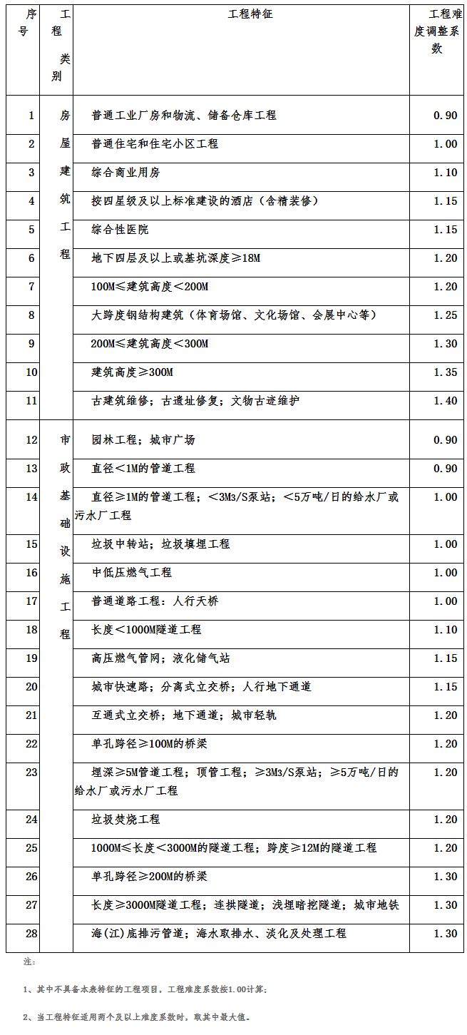 工程復雜程度分為一般、較復雜和復雜三個等級,其調整系數分別為:一般(Ⅰ級)0.85;較復雜(Ⅱ級)1.0;復雜(Ⅲ級)1.15。