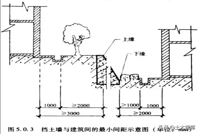 1、 居住區內的擋土墻與住宅建筑的間距應滿足住宅日照和通風的要求; 2 、高度大于2m的擋土墻和護坡的上緣與建筑間水平距離不應小于3m,其下緣與建筑間的水平距離不應小于2m。
