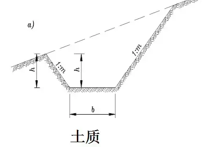 橫斷面:一般為梯形,溝的邊坡坡度,因巖土條件而定,一般采用1:1.0~1:1.5。溝底寬度b不小于0.5m,溝深h按設(shè)計流量而定,亦不應(yīng)小于0.5m。