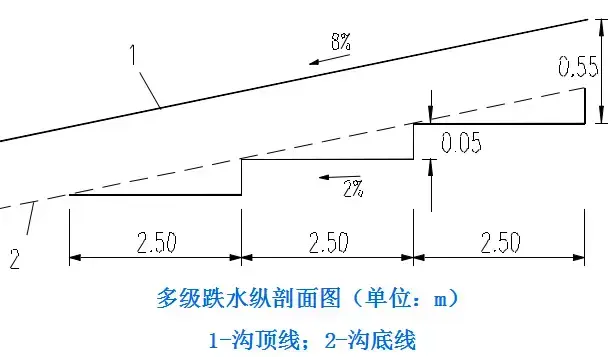 5.急流槽:在陡坡或深溝地段設(shè)置的坡度較陡、水流不離開槽底的溝槽稱作急流槽。急流槽的作用是在較短的距離內(nèi)以溝渠的方式引排水流、降低水頭,進而防止沖刷(可用于比跌水更陡的坡度,可達600)。