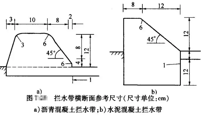 攔水帶可由瀝青混凝土現(xiàn)場澆筑,或者由水泥混凝土預(yù)制塊鋪砌而成。