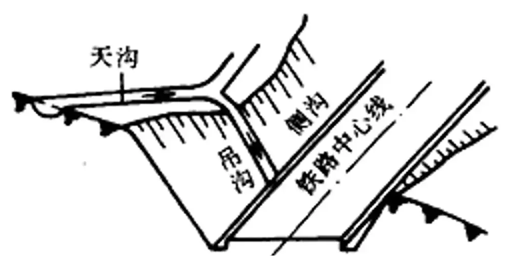 天溝設于路塹塹頂,用以排除山坡迎水方向流向路塹的地面水。路塹頂部無棄土堆時,天溝內邊緣至塹頂距離不宜小于5m;當溝內進行加固防滲時不應小于2m。
