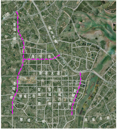 本次設(shè)計(jì)包括智城一路、智城五路、海寧街三條市政道路。智城一路為高地智慧城內(nèi)南北走向的城市主干路,南起慧城三街,北至325國(guó)道,路線全長(zhǎng)5198.815m,紅線寬度40m,設(shè)計(jì)速度60km/h。智城五路為高地智慧城內(nèi)南北走向的城市次干路,南起慧城三街,北至南海大道,路線全長(zhǎng)2158.647m,紅線寬度36m,設(shè)計(jì)速度50km/h。海寧街為高地智慧城內(nèi)東西走向的城市次干路,西起智城一路,東至南海大道,路線全長(zhǎng)1862.438m,紅線寬度36m,設(shè)計(jì)速度40km/h。道路沿線主要為村莊及待開(kāi)發(fā)用地,道路用地主要包括農(nóng)民的居住用地、耕地、菜地、苗圃、山丘、林地和魚(yú)蝦塘等等,局部地段有嶺地、河流、石化管線及高壓線穿過(guò),既有建筑物較多,類(lèi)型包括民宅、祠堂、學(xué)校等,且與G325、S280、海洋大道及多條村道等既有道路存在多次交叉。